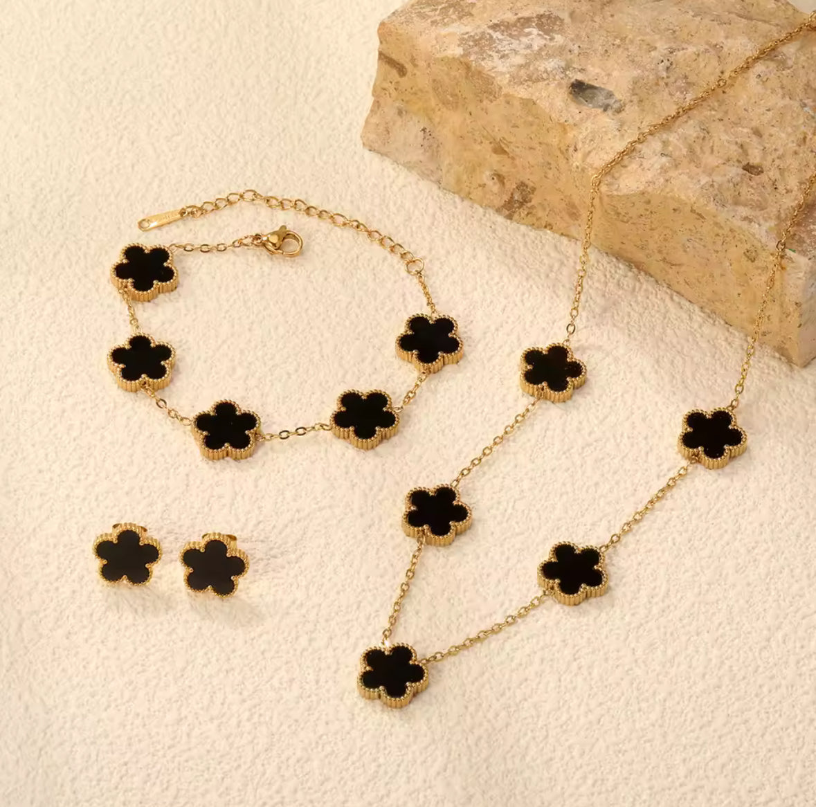- Combo de collar, aretes y pulsera en Acero Inoxidable con baño en oro de 24k.